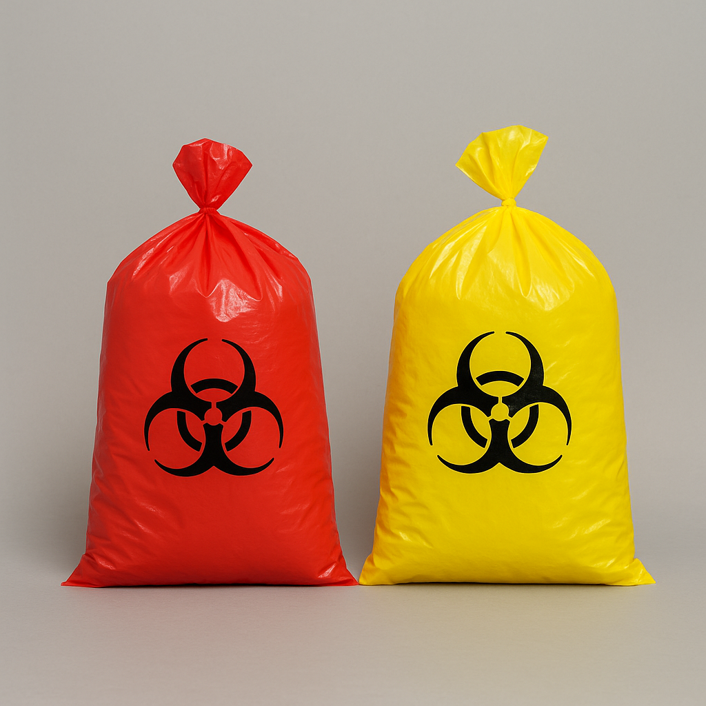 Σακούλα τυπωμένη (κίτρινη/κόκκινη) με ειδική σήμανση για τα μολυσματικά απόβλητα.